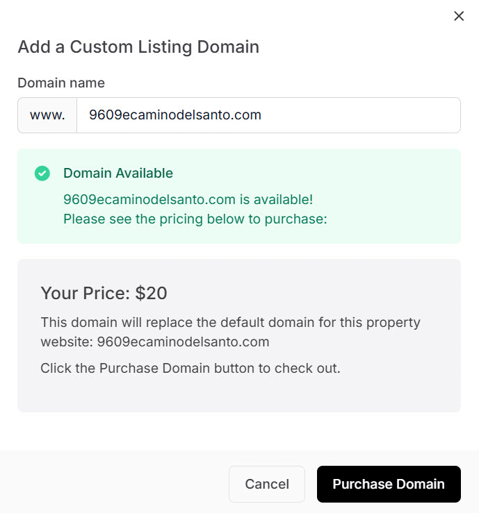 - Step 3. The system will let you know if the domain name is available and let you know the price. Click the Purchase Domain button (sample).