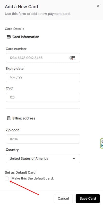The Personal Settings section allows you to conveniently change or add new credit or payment cards to your account. When you click on the black “Add New Card” button (sample image) then a New Card screen opens . For your convenience there is a “Set as Default Card” checkbox at the bottom of the screen.